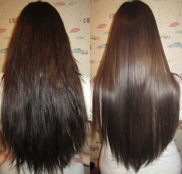 В итоге волосы избавляются от пористости, «узлов» и «дыр» в стержнях, сечения на концах. Проникший внутрь кератин утяжеляет пряди, что, естественно, уменьшает их объем. Чешуйки внешнего слоя закрываются, поэтому волосы выглядят увлажненными, начинают блестеть, не пушатся даже в дождливую погоду. Эффект разглаживания усиливается благодаря входящим в состав выпрямителя маслам и растительным экстрактам.